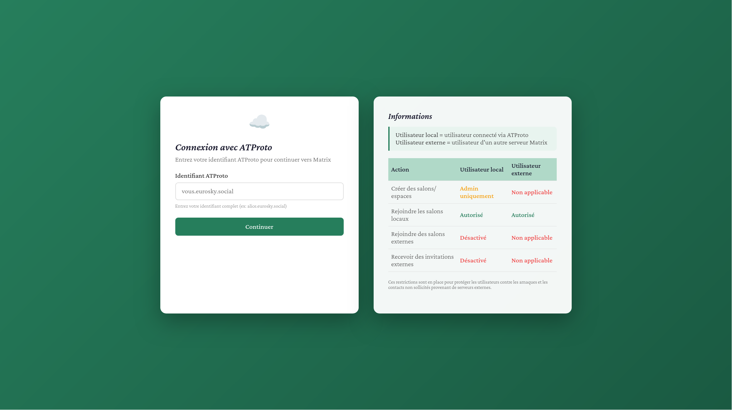 Vous pouvez rejoindre le salon #atproto-fr:atproto.fr sur matrix.atproto.fr en utilisant vos identifiants Bluesky/Eurosky/Blacksy/Northsky... sur mobile avec Element X element.io/fr/app